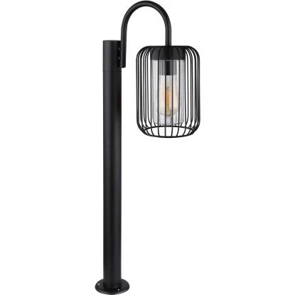 Diese edle Außenleuchte begeistert durch durchgehendes schwarz mattes Design aus Edelstahl. Aus einem runden Sockel ragt ein zylinderförmiges Gehäuse mit einer montierten geschwungenen Metallstange. Diese mündet an einer E27 Fassung mit einem formschönen Schirm aus Metallstäben (Ø 16 cm). Die E27 Fassung ermöglicht Ihnen bis zu einer maximalen Leistung von 15 Watt, selbst über Lichtfarbe und Helligkeit zu bestimmen. Aufgrund von Langlebigkeit und Stromersparnis empfehlen wir LED Leuchtmittel.