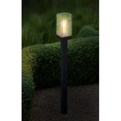 Diese hübsche Stehleuchte für den Außenbereich überzeugt durch ihr tolles Design. Diese rechteckige aus Druckguss gefertigte Außenleuchte in der Farbe matt Schwarz (10×10 cm) ist Spritzwassergeschützt und besitzt eine E27 Fassung welche Ihnen ermöglicht Leuchtmittel Ihrer Wahl, bis zu einer maximalen Leistung von 40 Watt, zu verwenden. Ein klarer rechteckiger Schirm bedeckt die E27 Fassung und besitzt eine Höhe von 1m.