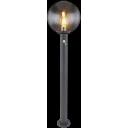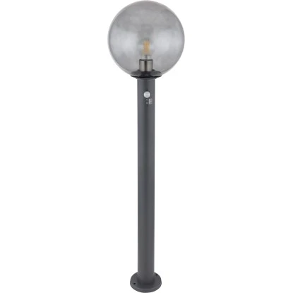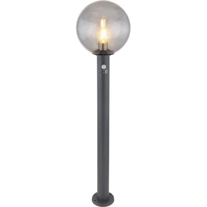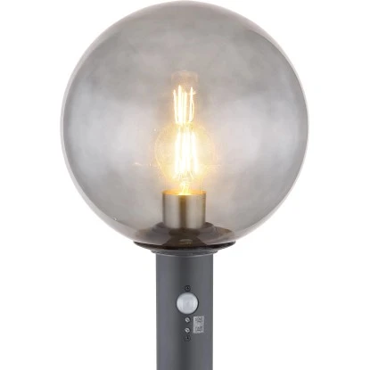 Die Außenlampe aus der Hedwig-Serie von Globo überzeugt durch ihr schlichtes Design aus anthrazitfarbenem Aluminium-Druckguss. Die 100 cm große Außenleuchte kann durch ihren schlichten Sockel wunderbar auf ebenen Untergründen fixiert werden. Außerdem verfügt sie über eine rauchige Glaskugel, welche auf einem Aluminiumzylinder fixiert ist und die E27-Fassung der Leuchte bedeckt. Die können Sie mit einem passenden LED-Leuchtmittel Ihrer Wahl bestücken, wodurch Sie die Möglichkeit haben, Lichtfarbe und Helligkeit individuell zu bestimmen. Außerdem ist die Leuchte mit einem inkludierten Bewegungsmelder ausgestattet. Durch weitere Artikel der gleichen Serie können Sie das Gesamtbild in Ihren Außenbereich komplettieren.