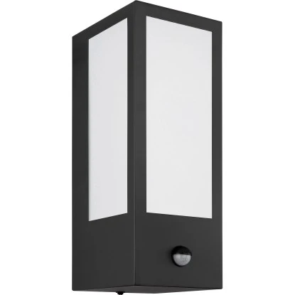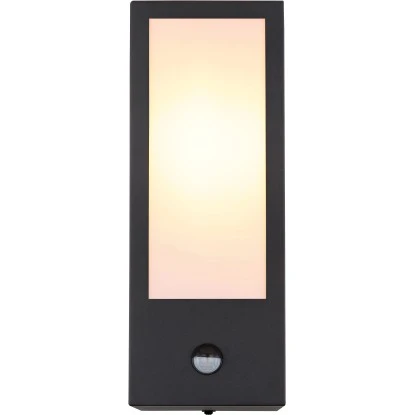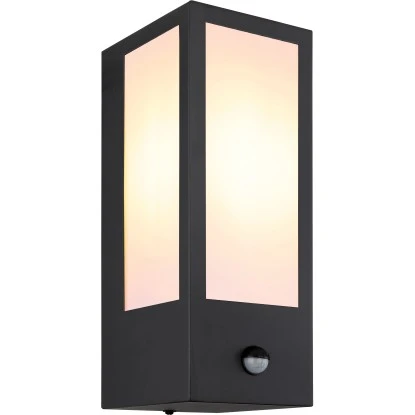 Diese moderne Außenleuchte überzeugt durch tolles schlichtes Design aus Glas und Metall. Diese Leuchte in Schwarz besteht aus einem rechteckigen Metallkäfig (12×32 cm) und einer schönen opalen Glaswand an jeder Seite. Die E27 Fassung ermöglicht Ihnen Lichtfarbe und Helligkeit bis zu einer maximalen Leitung von 60 Watt, selbst zu bestimmen. Ein weiteres Highlight dieser Leuchte ist der integrierte Sensor, dieser reagiert bei einer Reichweite von 4-8 m und 110°. Der Schutzgrad IP44 gegen Spritzwasser sorgt für ein sorgenfreies Anbringen der Leuchte im Außenbereich.