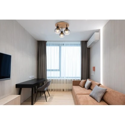Diese schöne Deckenleuchte der Serie MOITAS begeistert durch tolles Design. Aus einer runden Deckenbefestigung (Ø 38 cm) ragen drei kurze Metallstangen zu je einer E27 Fassungen mit jeweils einem Glasschirm in Rauchfarben. Die E27 Fassungen ermöglichen Ihnen, bis zu einer maximalen Leistung von 40 Watt, selbst über Lichtfarbe und Stärke zu entscheiden.