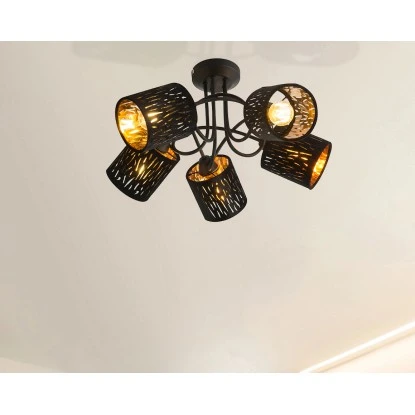 Das elegante Design der modernen und stilvollen Deckenleuchte Tuxon sorgt in jedem Wohnraum für ein harmonisches Flair. Die Leuchtenschirme sind nicht nur ein Blickfang, weil sie mit schwarzem Samtstoff überzogen sind, sondern auch wegen der Dekorstanzungen am Schirm. Durch die Dekorstanzungen wird das Licht beeindrucken reflektiert. Die Innenschirme sind goldfarben, dadurch wirkt das Licht sehr warm und angenehm. Die fünf Leuchtenschirme sind an einer optisch verknoteten Deckenhalterung (Ø 46 cm) angebracht. Die Deckenleuchte verfügt über fünf E14-Fassungen, dadurch haben Sie die Möglichkeit die Leuchtmittel (max. 25 Watt) frei auszuwählen, je nachdem welche Lichtstärke und Lichtfarbe Sie gerne hätten. Diese Deckenleuchte lässt sich wunderbar in ein Schlafzimmer intergieren und passt zu vielen Einrichtungsstilen.