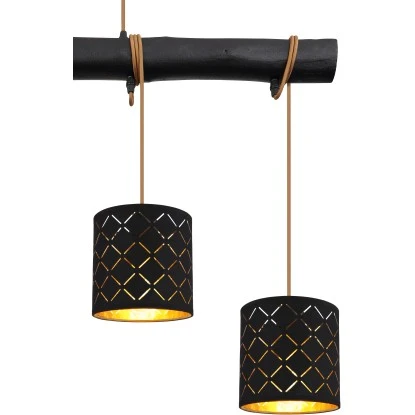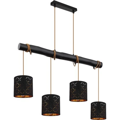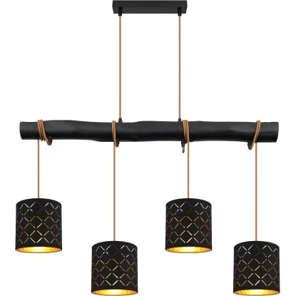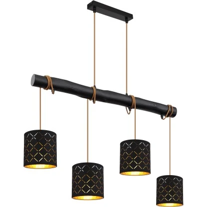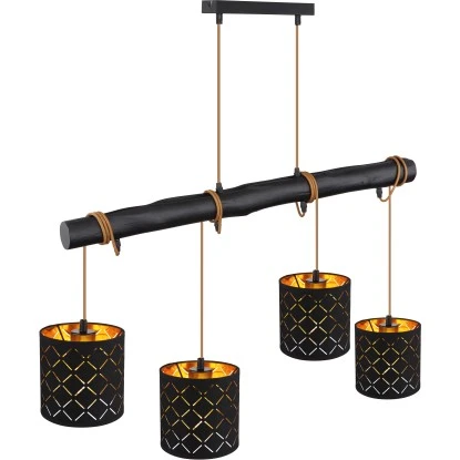 Die Hängeleuchte aus der Serie Clarke von Globo überzeugt durch Ihr schönes Design aus Schwarz und Gold. Die Hängeleuchte besteht aus 4 Schirmen mit einem Durchmesser von 15 cm mit Dekorstanzungen welche jeweils mit einer E27 Fassung ausgestattet sind und an goldfarbenen Kabeln von der Decke hängen. Die Höhe der Hängeleuchte kann mithilfe der 85 cm langen schwarzen Holzstange, insgesamt 150 cm angepasst werden in dem man sie einfach umwickelt. Die E27 Fassungen ermöglichen Ihnen Leuchtmittel Ihrer Wahl, bis zu einer maximalen Leistung von 40 Watt, zu verwenden. Mit weiteren Modellen Dier Serie können Sie Ihren Wohnbereich verschönern.