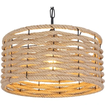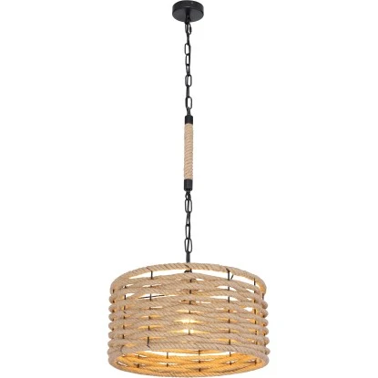 Die Hängelampe aus der Halia-Serie von Globo eignet sich wunderbar für Ihre Innenräume. Sie besteht aus einem schwarz-mattem Metallgitterschirm mit einem Durchmesser von 40 cm, welcher mit Hanfseil umwickelt ist und einer Metallkette mit einem schwarzen, ebenfalls mit Hanfseil umwickelten Metallstab von der Decke hängt. Die Höhe der Deckenleuchte können Sie bei der Montage auf bis zu 151 cm anpassen. Außerdem können Sie den Schirm mit einem E27-Leuchtmittel Ihrer Wahl bestücken, wodurch Sie die Möglichkeit haben, Lichtfarbe und Helligkeit nach Ihren Vorstellungen zu bestimmen. Durch weitere Modelle der gleichen Serie können Sie das Gesamtbild in Ihren vier Wänden komplettieren und für ein stilvolles Ambiente sorgen.