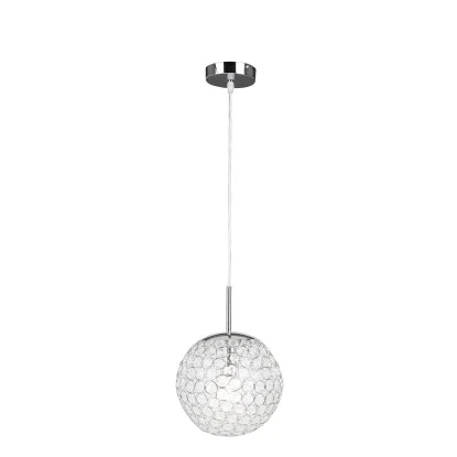 Die Pendelleuchte Konda besteht aus einer klaren Kunststoffkristallkugel in einer Chromhalterung. Die Leuchte ist mit einem E27 Sockel für maximal 60 W ausgelegt.