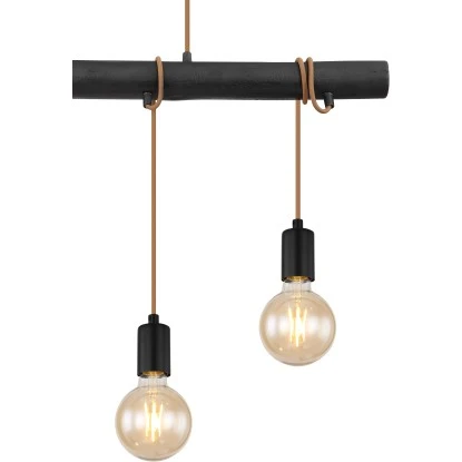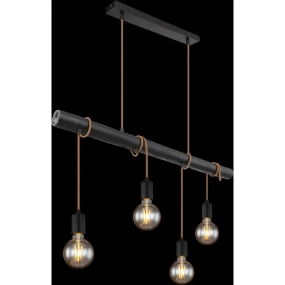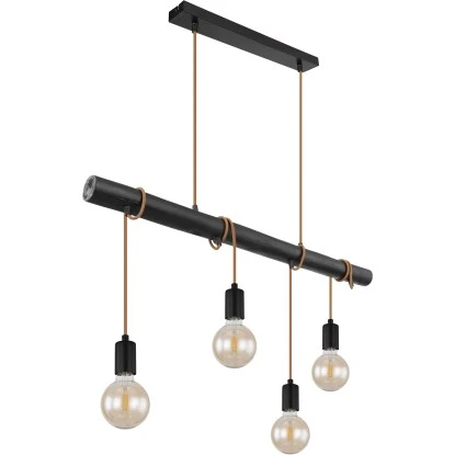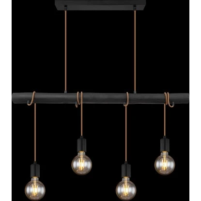 Die Hängelampe aus der Leo-Serie von Globo fügt sich wunderbar ins Ambiente verschiedenster Wohnstile. Die 90 cm lange Hängeleuchte besteht aus einem schwarzen Holzstab, der an zwei Kabeln von der Decke hängt. Die vier E27-Fassungen hängen an um den Stab gewickelten Kabeln und können mit passenden Leuchtmitteln Ihrer Wahl bestückt werden, wodurch Sie Lichtfarbe und Helligkeit individuell bestimmen können. Außerdem kann die Höhe der Hängeleuchte bei der Montage auf bis zu 120 cm angepasst werden. Durch weitere Artikel der gleichen Serie können Sie das Gesamtbild in Ihren vier Wänden komplettieren.