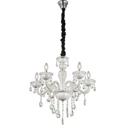 Der klassische und im traditionellen Stil gehaltene Lüster Teejay punktet durch sein zeitloses Design. Die an einer Textilaufhängung montierte und aus weißem Metall gefertigte Hängelampe mit den schmückenden klaren K5 Kristallen bietet Ihnen die Möglichkeit in den sechs, in Glasschalen eingebetteten E14 Fassungen, beliebige Leuchtmittel (max.40W) einzusetzen. Aufgrund ihrer Stromersparnis und Langlebigkeit empfehlen wir LED-Lampen.