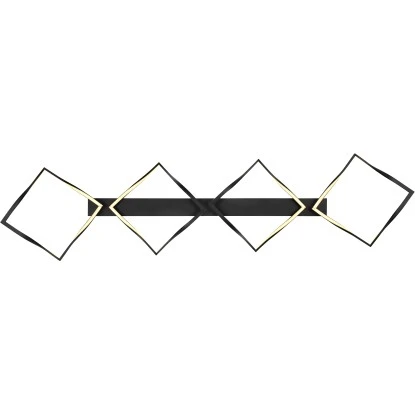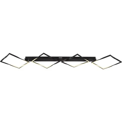 Diese moderne Deckenleuchte überzeugt durch ein tolles Design. An einer rechteckigen Deckenbefestigung befinden sich vier quadratische LED Paneele mit verdrehten Rahmen, welche ein angenehmes 3000 Kelvin warmweißes Licht abgeben. Die knapp 177 cm lange und 40 cm breite Deckenleuchte wird mit matt schwarzem Aluminium veredelt.