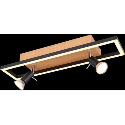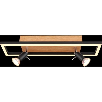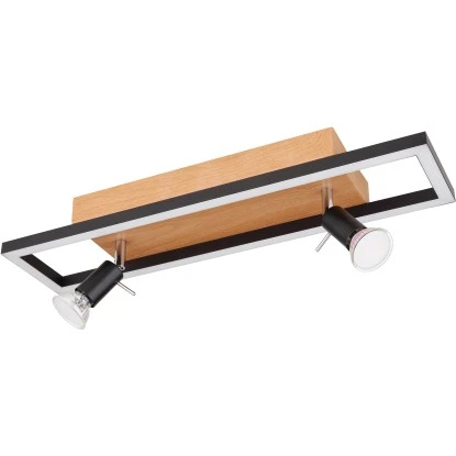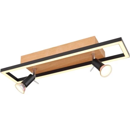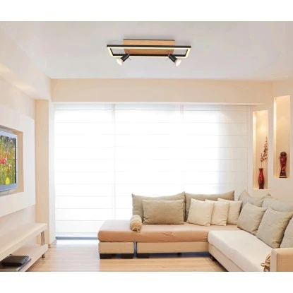 Diese moderne Deckenleuchte begeistert durch ihr tolles Aussehen. Aus einem Holzblock ragen zwei GU10 Fassungen mit einem zusätzlichen formschönen rechteckigen LED Paneel (52×11 cm). Sie erzeugt ein 3000 Kelvin warmweißes Licht für eine angenehme Raumatmosphäre.