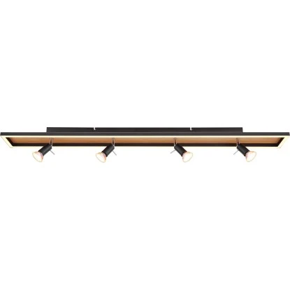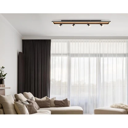 Diese moderne Deckenleuchte begeistert durch ihr tolles Aussehen. Aus einem Holzblock ragen vier GU10 Fassungen mit einem zusätzlichen formschönen rechteckigen LED Paneel (110×11 cm). Sie erzeugt ein 3000 Kelvin warmweißes Licht für eine angenehme Raumatmosphäre.