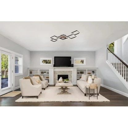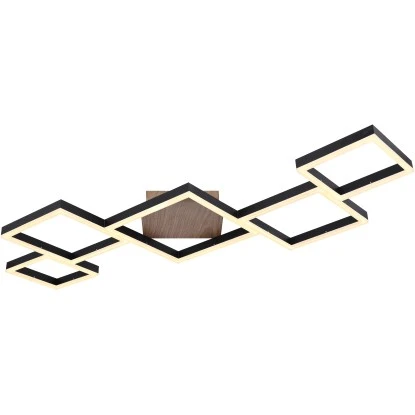 Diese moderne Deckenlampe aus der Kurio-Serie ist mit ihrem wunderschönen Design aus Holzoptik und schwarz-mattem Metall eine stilvolle Ergänzung für Ihre Wohnräume. Die 120 cm lange Deckenleuchte besteht aus fünf quadratischen Metallrahmen, die nach außen hin kleiner werden. Durch das opalene Acryl der Metallrahmen leisten die LED-Leuchtmittel 1800 Lumen starkes Licht.