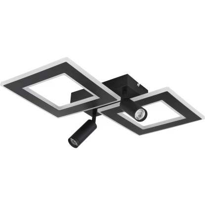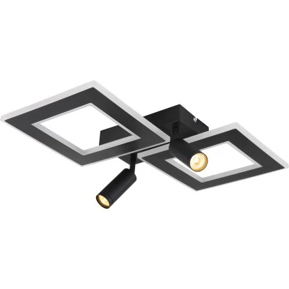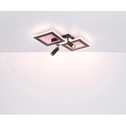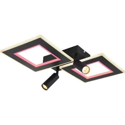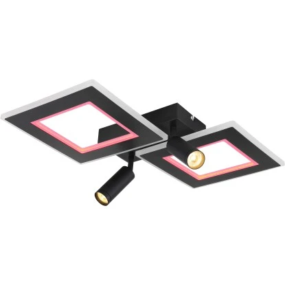 Bestehend aus 2 quadratischen LED-Paneelen mit Rot, Grün und Blau Funktion und 2 zylinderförmigen drehbaren GU10 Fassungen scheint die Leuchte von 2700 Kelvin warmweißen bis zu 6500 Kelvin kaltweißem Licht. Mittels der mitgelieferten Fernbedienung und der Memory Funktion, können Sie die Leuchte dimmen und in mehreren Lichtstufen fixieren. Setzen Sie neue Akzente in Ihren Räumen.