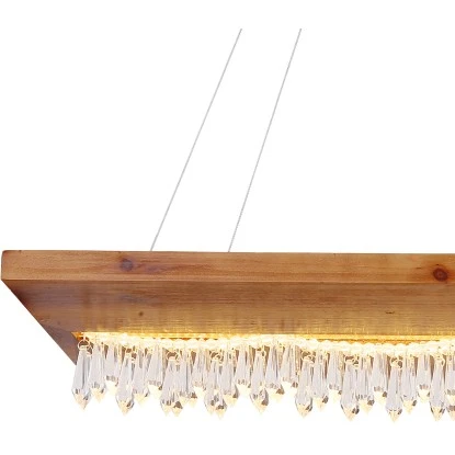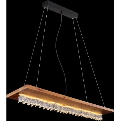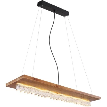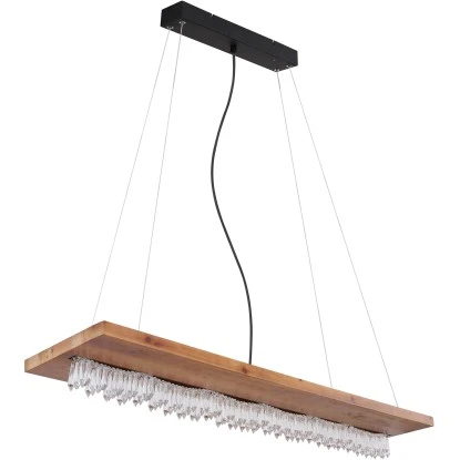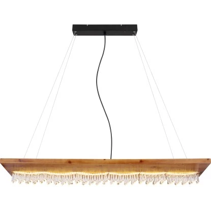 Diese Pendelleuchte aus der Edeltraud-Serie ist eine elegante Ergänzung für Ihre Innenräume. Sie besteht aus einer braunen Holzplatte (100×25 cm), die an vier seilen und einem schwarzen Kabel von der Decke hängt und in der Mitte mit wunderschönen Kunststoffkristallen versehen ist. Diese bedecken die inkludierten LED-Leuchtmittel, welche 2023 Lumen starkes Licht bei einer angenehmen Lichtfarbe von 3000 Kelvin (warmweiß) leisten. Außerdem kann die Höhe der Pendelleuchte bei der Montage auf bis zu 145 cm angepasst werden. Durch weitere Artikel der gleichen Serie können Sie das Gesamtbild in Ihren vier Wänden komplettieren und für ein stilvolles Ambiente sorgen.