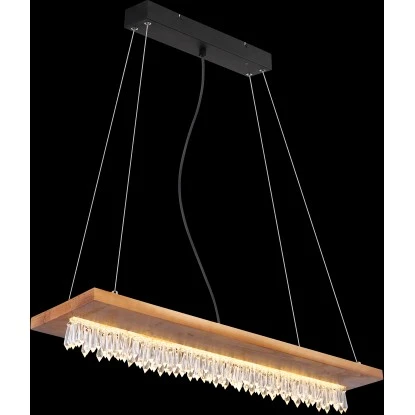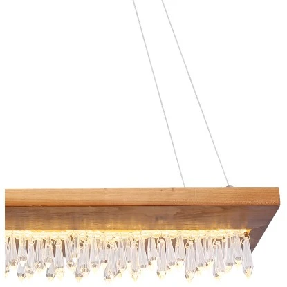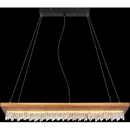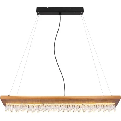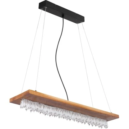 Diese Pendelleuchte aus der Alina-Serie (80×20 cm) ergänzt Ihr Zuhause um eine elegante Lichtquelle. Sie besteht aus einem braunen Holzbalken, der an vier Metallseilen befestigt und in der Mitte mit einer opalenen Kunststoffleiste versehen ist, an dem wunderschöne Kunststoffkristalle hängen. Diese bedeckt die inkludierten LED-Leuchtmittel, welche 1546 Lumen starkes Licht bei einer angenehmen Lichtfarbe von 3000 Kelvin (warmweiß) leisten. Außerdem kann die Höhe der Pendelleuchte bei der Montage auf bis zu 145 cm angepasst werden. Durch weitere Modelle der gleichen Serie können Sie Ihren Innenräumen den letzten Feinschliff verpassen.