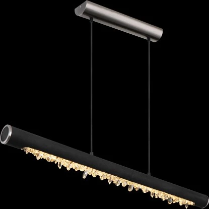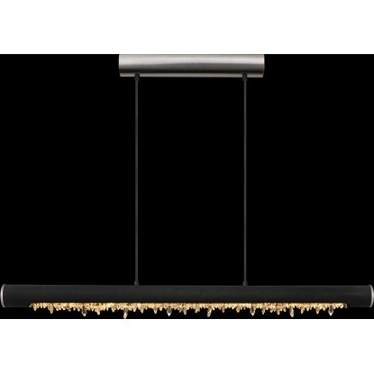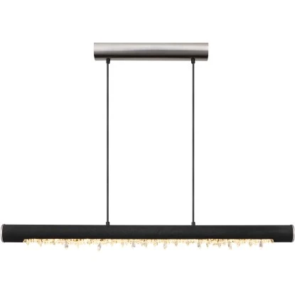 Mit dieser 100 cm langen Pendelleuchte aus der Felicitas-Serie erweitern Sie Ihren Innenbereich um eine elegante Lichtquelle. Sie besteht aus einem schwarzen Holzstab, der an zwei schwarzen Kabeln von der Decke hängt und an beiden Enden über nickel-matte Metallringe verfügt. An der Unterseite ist sie mit wunderschönen Acrylkristallen versehen, welche die inkludierten LED-Leuchtmittel bedecken. Diese leisten 980 Lumen starkes Licht bei einer angenehmen Lichtfarbe von 3000 Kelvin (warmweiß). Außerdem kann die Höhe der Pendelleuchte bei der Montage auf bis zu 150 cm angepasst werden. Durch weitere Artikel der gleichen Serie können Sie das Gesamtbild in Ihren Innenräumen komplettieren.