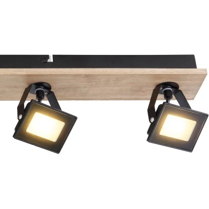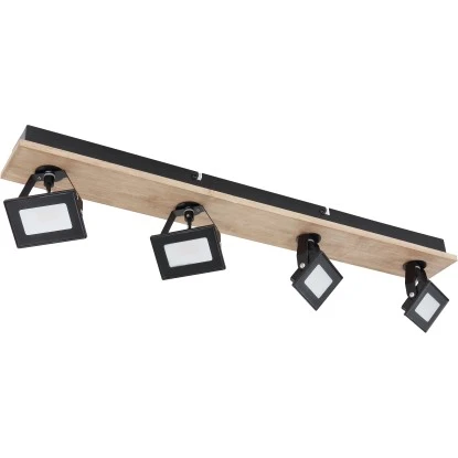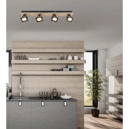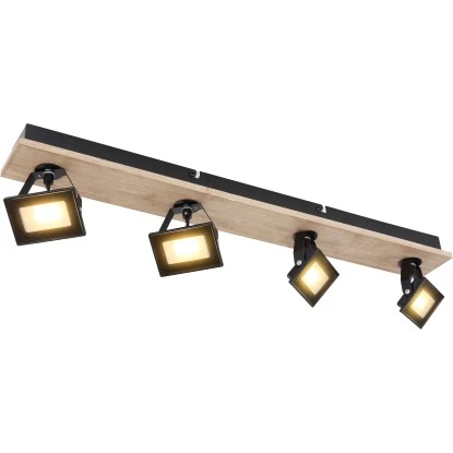 Dieser Deckenstrahler aus der Joya-Serie besticht durch sein wunderschönes Design aus schwarz-mattem Metall und Holz. Die vier schwenkbaren Strahler sind mit satiniertem Glas versehen und mittels Bügel auf der Holzplatte (66×8 cm) montiert. Durch die inkludierten LED-Leuchtmittel leistet der Deckenstrahler 1680 Lumen starkes Licht bei einer angenehmen Lichtfarbe von 3000 Kelvin (warmweiß). Durch weitere Artikel der Joya-Serie können Sie das Gesamtbild Ihrer Innenräume komplettieren.