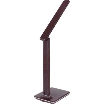 Diese technikaffine Tischleuchte TANNA besteht aus dunkelbraunem Kunststoff in Lederoptik kombiniert mit dezenten Chromelementen.
