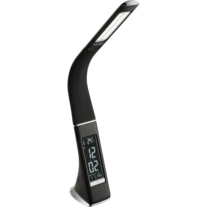 Die Tischlampe Sophie könnte das Highlight auf Ihrem Schreibtisch werden. Aus verchromten Metall und schwarzem Kunststoff hergestellt, bietet sie neben der Möglichkeit einer Verstellung der Lichtfarbe (Kelvin) des flexiblen Lampenarms auch ein Display, auf dem Uhrzeit, Kalender und Raumtemperatur angezeigt wird. Das serienmäßig eingebaute LED leistet 220 Lumen.
