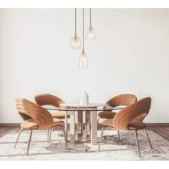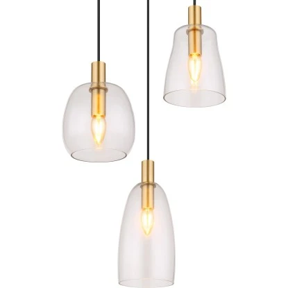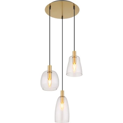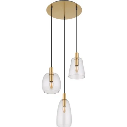 Diese elegante Pendelleuchte begeistert durch schönes Design. Aus einer runden Deckenbefestigung (Ø 35 cm) in der Farbe Messing ragen drei schwarze Kabel in unterschiedlichen Längen bis zu 1,5 m zu je einer E14 Fassung, welche mit formschönen Glasschirmen in verschiedenen Formen und Verzierungen in Messing ausgestattet sind. Die E14 Fassungen ermöglichen Ihnen bis zu einer maximalen Leistung von 40 Watt, selbst über Lichtfarbe und Helligkeit zu bestimmen. Aufgrund von Langlebigkeit und Stromersparnis empfehlen wir LED Leuchtmittel.