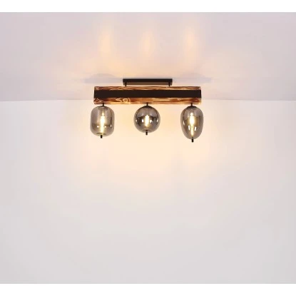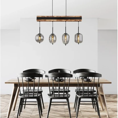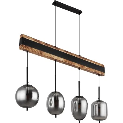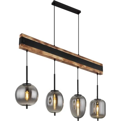 Diese moderne Pendelleuchte begeistert durch ein tolles Design. An einer rechteckigen Deckenbefestigung verlaufen zwei Kabel zu einem formschönen Holzbalken mit einer Länge von 1 m an dem sich vier E14 Fassungen mit jeweils einem rauchigen Schirm in unterschiedlichen Formen befindet. Die E14 Fassungen ermöglichen Ihnen bis zu einer maximalen Leistung von 40 Watt, selbst über Lichtfarbe und Helligkeit zu bestimmen. Aufgrund von Langlebigkeit und Stromersparnis empfehlen wir LED Leuchtmittel.