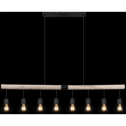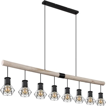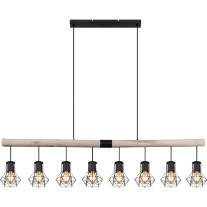 Diese tolle Pendelleuchte begeistert durch schönes Design. Aus einer rechteckigen Deckenbefestigung ragen zwei Kabel und münden an einen Holzbalken mit einer Länge von 1,4 m, an diesem sich acht E27 Fassungen mit jeweils einem Schirm mit Metallgeflechten befindet. Die E27 Fassungen ermöglichen Ihnen selbst, bis zu einer maximalen Leistung von 60, über Lichtfarbe und Helligkeit zu bestimmen.