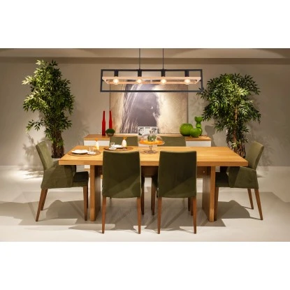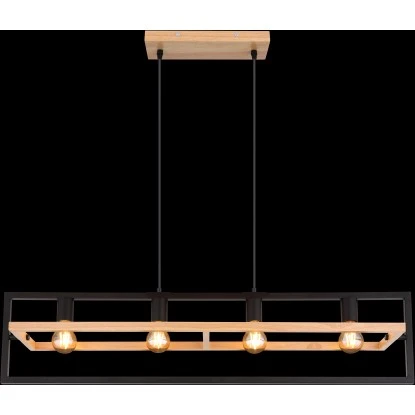 Diese äußerst moderne Deckenleuchte aus der Serie Erica begeistert durch ihr tolles Design. Diese besteht aus einem schwarz matt rechteckigen Metallgerüst mit einer Länge von 98 cm an dem sich vier E27 Fassungen befinden und von einem weiteren beweglichen Rechteck aus Holz mit einer Breite von 20 cm umkreist wird. Von einer rechteckigen Deckenhalterung aus Holz hängt die Leuchte an zwei Metallstäben 1,5m von der Decke. Die E27 Fassungen ermöglichen Ihnen die freie Auswahl, bis zu einer maximalen Leistung von 40 Watt, zu bestücken.