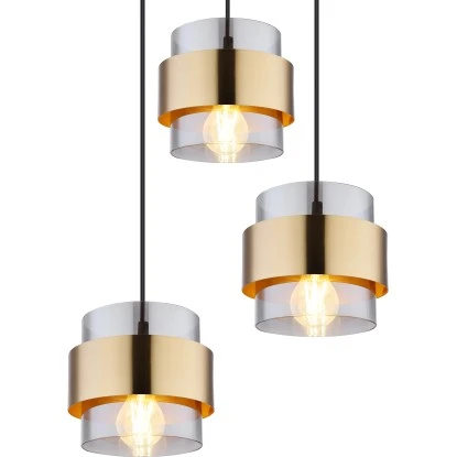Diese Pendelleuchte (Ø 45 cm) überzeugt durch ihr ästhetisches Design aus Metall und rauchigem Glas. Sie besteht aus einer runden, schwarzen Metallplatte (Ø 35 cm), an der drei schwarze Kabel hängen. Diese sind mit zylinderförmigen, rauchigen Glasschirmen mit Messingring (Ø 18 cm) versehen, welche mit E27-Leuchtmitteln Ihrer Wahl bestückt werden können. Dadurch haben Sie die Möglichkeit, Lichtfarbe und Helligkeit individuell zu bestimmen. Außerdem kann die Höhe der Pendelleuchte bei der Montage auf bis zu 120 cm angepasst werden. Durch weitere Modelle der gleichen Serie können Sie in Ihren Innenräumen für ein stilvolles Ambiente sorgen und das Gesamtbild komplettieren.