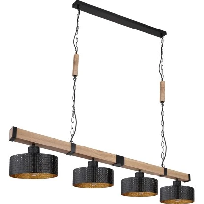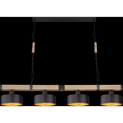 Diese moderne Pendelleuchte der Serie RIELLY begeistert durch tolle Farbgebung aus Gold, Schwarz und Holzoptik. Aus einer rechteckigen Deckenbefestigung verlaufen 2 formschöne Ketten mit Kabel zu einem 1,4 m langen Balken in Holzoptik an dem sich vier E27 Fassungen mit jeweils formschönen dekorativen Schirmen in Schwarz und Gold befinden. Aufgrund von Langlebigkeit und Stromersparnis empfehlen wir LED Leuchtmittel.