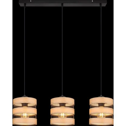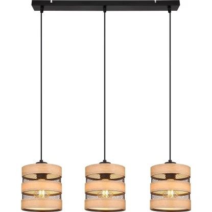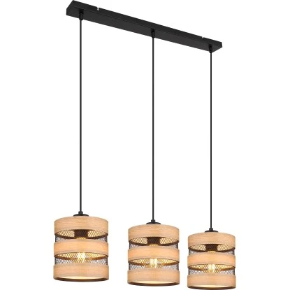 Diese tolle Pendelleuchte begeistert durch Ihr schlichtes Design. Drei E27 Fassungen hängen an jeweils einem schwarzen Kabel 1,2m an einer schmalen (75×18 cm) Deckenbefestigung von der Decke. Die E27 Fassungen sind mit einem schönen Schirm aus Metallgittern und Verzierungen in Holzoptik bestückt. Sie ermöglichen Ihnen selbst, bis zu einer maximalen Leistung von 40 Watt, über Lichtfarbe und Helligkeit zu bestimmen.
