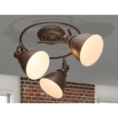 Drei rostfarbige Strahler (Schirm Innenfarbe: Weiß) sind bei der Deckenlampe Giorgio formschön an einer runden Schiene befestigt und bieten mit ihren drei E14 Fassungen die Möglichkeit diverse Leuchtmittel zu nutzen, um dadurch auch die Helligkeit zu kontrollieren. Aufgrund ihrer Stromersparnis und Langlebigkeit empfehlen wir LED-Lampen.