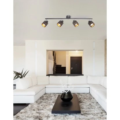 Die stilvolle und elegante Strahlerserie Troy punktet eindeutig mit ihrer Materialkombination. Die vier beweglichen und an zwei geraden Armen befestigten, gestanzten, zylinderförmigen Schirme dieses Strahlers sind mit schwarzem Samt überzogen, was wunderbar zur goldfarbenen Innenseite der Spots passt, die damit für ein wunderschönes Licht sorgen. Das schwarze Metall der Halterung sowie einzelne verchromte Teile ergänzen das Bild und machen diesen Strahler zu einem wahren Hingucker. Die Strahler verfügen über je eine E14-Fassung, die es Ihnen ermöglicht das Leuchtmittel und damit Lichtstärke und Lichtfarbe selbst zu bestimmen (max. 8 W). Mit weiteren Modellen dieser Serie können Sie das Bild in Ihren Räumlichkeiten komplettieren.