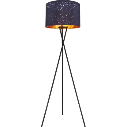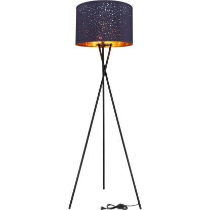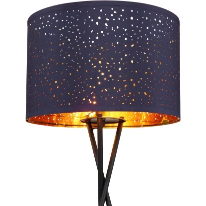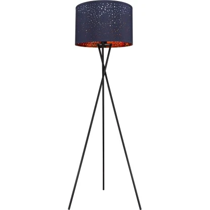 Diese wunderschöne Stehleuchte begeistert durch ein tolles Design. Aus einem Dreibein ragen drei 1,6 m langen Metallstangen und mündet an einer E27 Fassung. An der E27 Fassung befindet sich ein blauer Schirm (Ø 45 cm) mit Musterstanzungen und kupferfarbener Innenseite. Die E27 Fassung ermöglicht Ihnen bis zu einer maximalen Leistung von 60 Watt, selbst über Lichtfarbe und Helligkeit zu bestimmen. Aufgrund von Langlebigkeit und Stromersparnis empfehlen wir LED Leuchtmittel.