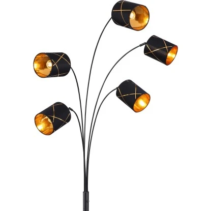 Die geschmackvolle fünf armige Stehleuchte BEMMO überzeugt mit den eleganten, schwarz- goldfarbenen Textilschirmen. Das Licht dieser wunderschönen Stehlampe reflektiert durch das an der Innenseite des Lampenschirms angebrachte goldfarbige Acryl wunderbar. Durch die freie Wahl der Leuchtmittel (exkl. E14 max. 25 W) entscheiden Sie in welcher Lichtfarbe Ihr Heim erstrahlt. Platziert neben dem Sofa oder dem Esstisch wird diese Leuchte zum echten Blickfang.
