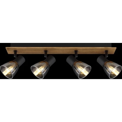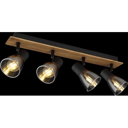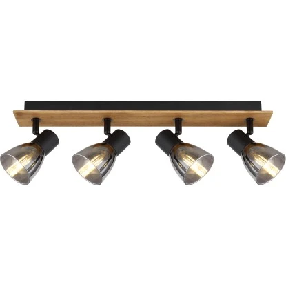 Dieser schöne Strahler der Claude Serie in schwarzen Metall begeistert durch tolles Design. An einer rechteckigen Deckenbefestigung mit Holzverzierungen(50×7 cm) befinden sich vier E14 Fassungen mit jeweils einem schönen Glasschirm in Rauchfarben (Ø7 cm). Geschaltet wird die Leuchte mittels ON/OFF Schalter. Die E14 Fassung überlässt Ihnen die Möglichkeit, bis zu einer maximalen Leistung von 40 Watt, selbst über Lichtfarbe und Helligkeit zu bestimmen. Mit weiteren Modellen dieser Serie können Sie Ihren Wohnbereich wundervoll ergänzen.