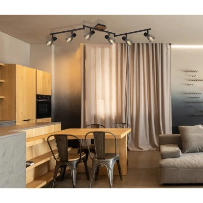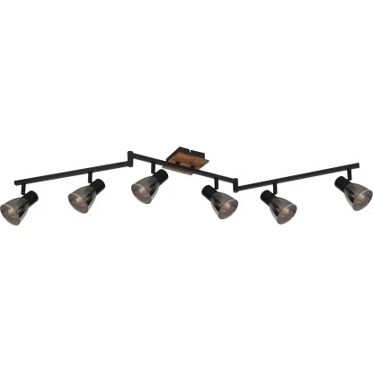 Ein toller Strahler, welcher für jeden Gebrauch passend ist. Ob Küche, Flur oder Wohnraum, dieser 145 cm lange Strahler passt einfach überall hin. Durch die schwarz matten und holzfarbenden Bestandteile und das rauchfarbene Glas bekommt er seine besondere Ausstrahlung. Die sechs E14 Fassungen ermöglichen Ihnen bis zu einer maximalen Leistung von 40 Watt, selbst über Lichtfarbe und Helligkeit zu bestimmen. Aufgrund von Langlebigkeit und Stromersparnis empfehlen wir Ihnen LED Leuchtmittel.