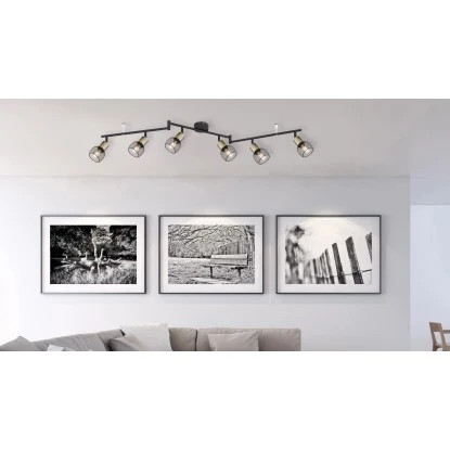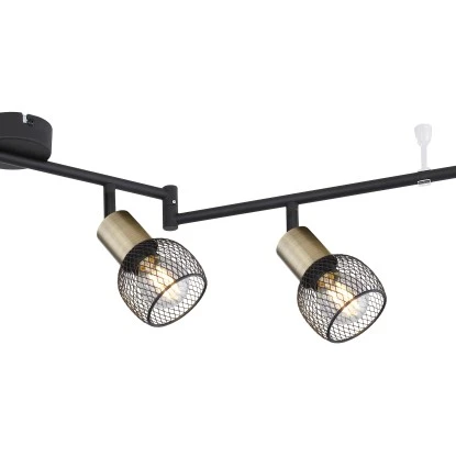 Dieser Deckenstrahler der Fiastra-Serie überzeugt durch sein stilvolles Design aus schwarz-mattem Metall und Altmessing. Der 120 cm lange Strahler besteht aus drei Metallstäben, deren Winkel Sie bei der Montage anpassen können und die mit jeweils zwei von Altmessing umrahmten E14-Fassungen mit schwarzen Metallgitterschirmen versehen sind. Diese können Sie mit passenden Leuchtmitteln Ihrer Wahl bestücken, wodurch Sie Lichtfarbe und Helligkeit individuell bestimmen können. Durch mehrere Modelle der gleichen Serie können Sie das Gesamtbild in Ihren vier Wänden komplettieren.