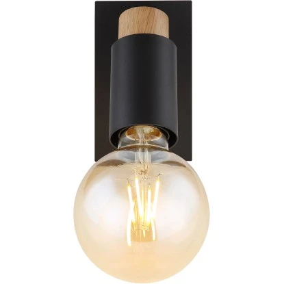 Diese moderne Wandleuchte begeistert durch tolles Design. Aus einem schwarz matten rechteckigen Wandschild (8×14 cm) mit integrierten Kippschalter befindet sich eine formschöne E27Fassung mit einem Überhang von 14,5 cm. Diese ist mit Materialien aus Holz und Metall verziert und erschafft somit ein tolles Gesamtbild. Aufgrund ihrer Langlebigkeit und Stromersparnis empfehlen wir LED Leuchtmittel.