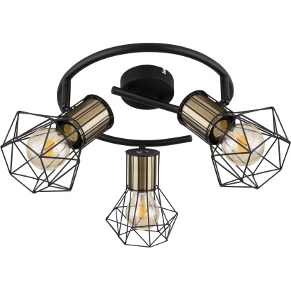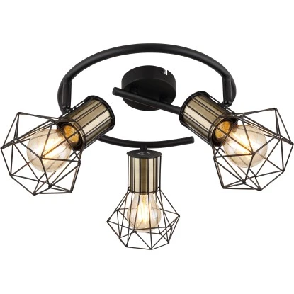 Dieser wunderschöne Strahler begeistert durch tolles Design. Drei E27 Fassungen mit Altmessing befinden sich auf einer kreisförmigen schwarzen Stange (Ø 28,5 cm) welche mittels einem runden Sockel an der Decke montiert wird. Auf den E27 Fassungen befinden sich formschöne Schirme in Form eines Metallgeflechtes. Die Auswahl über das Leuchtmittel ist bis zu einer maximalen Leistung von 40 Watt frei wählbar.