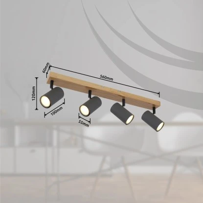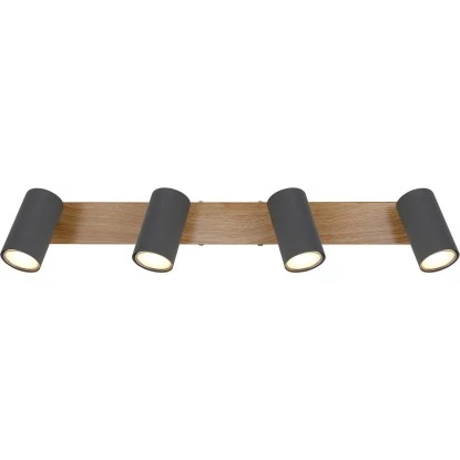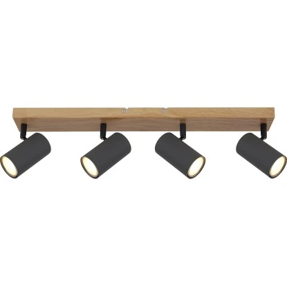 Dieser schlichte Strahler der Robby Serie begeistert durch Design und Farbgebung. An einer rechteckigen Deckenhalterung in Holzdesign (56×6 cm) befinden sich vier GU10 Fassungen, bedeckt von jeweils einem zylinderförmigen Schirm in matten Graphit. Die GU10 Fassung, ermöglicht Ihnen die freie Wahl an Leuchtmitteln, bis zu einer maximalen Leistung von 35 Watt.