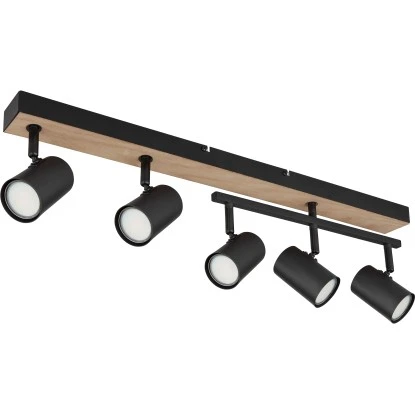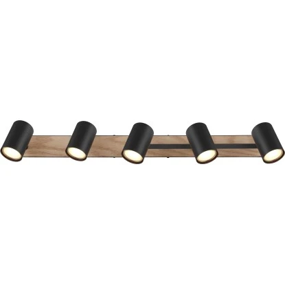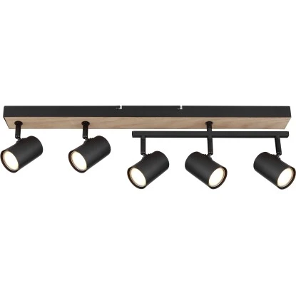 Dieser wunderschöne Strahler begeistert durch tolles Design aus schwarz matten Metall und MDF in Holzoptik. An einer 70 cm langen Stange befinden sich zwei GU10 Fassungen mit beweglichen Gelenken und drei weiteren GU10 Fassungen mit einer zusätzlichen beweglichen Stange. Die GU10 Fassungen ermöglichen Ihnen die freie Auswahl, bis zu einer maximalen Leistung von 35 Watt, Ihrer Leuchtmittel.