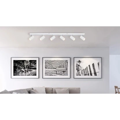 Dieser schlichte Deckenstrahler aus Metall der Serie Robby besticht durch sein durchgehendes weiß-verchromten Design. Der knapp 1,2m lange Strahler ist mit sechs schwenkbaren GU10 Fassungen ausgestattet. Durch die freie Wahl des Leuchtmittels können Sie selbst, bis zu einer maximalen Leistung von 35 Watt, über Lichtfarbe und Stärke bestimmen. Aufgrund ihrer Stromersparnis und Langlebigkeit empfehlen wir LED-Leuchtmittel.