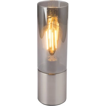 Die kompakt gebaute nickelmatte Tischleuchte Annika hat ein dezentes Design und kann dadurch in jeden Raum integriert werden. Der zylinderförmige Schirm (Ø 9 cm) ist aus einem verdunkelten Glas. Im eingeschalteten Zustand scheint das Leuchtmittel ganz zart durch. Ein Highlight dieser 30 cm hohen Leuchte ist, dass sie über einen Touch-Schalter verfügt. Dadurch können Sie die Leuchte ganz einfach Ein- und Ausschalten. Da die Leuchte mit einer E27-Fassung ausgestattet ist, können Sie das Leuchtmittel bis max. 25 Watt, sowie die Lichtfarbe und Lichtstärke bestimmen. Wir empfehlen LED-Leuchtmittel, aufgrund ihrer Stromersparnis und Langlebigkeit. Annika integriert sich wunderbar als Nachttischleuchte, kann aber auch auf Beistelltischen und Kommoden im Wohnbereich platziert werden – wo sie eine gemütliche Akzentbeleuchtung erzeugt.
