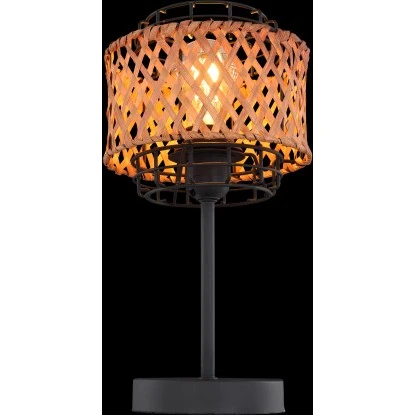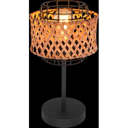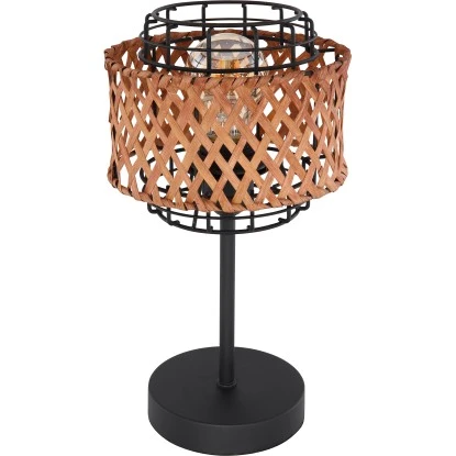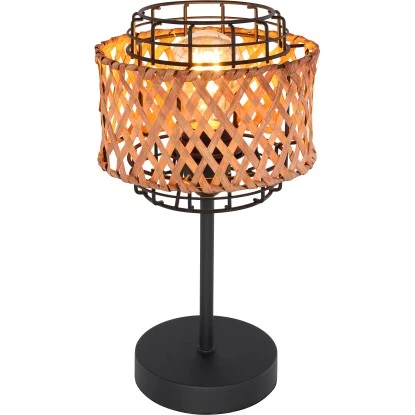 Mit Dier Tischlampe aus der Gina-Serie von Globo mit einem Durchmesser von 17 cm können Sie Ihre Innenräume um eine elegante Lichtquelle ergänzen. Die 32 cm große Tischleuchte besteht aus einem runden, schwarzen Metallsockel, an dem ein schwarzer Metallstab fixiert ist. Die E27-Fassung an der Spitze des Stabes wird von einem schwarzen Metallgitterschirm, welcher über einen Ring aus verflochtenem Bambus verfügt, umgeben. Außerdem kann die Fassung mit einem passenden Leuchtmittel Ihrer Wahl bestückt werden, wodurch Sie die Möglichkeit haben, Lichtfarbe und Helligkeit individuell zu bestimmen. Außerdem ist die Tischleuchte mit einem inkludierten Schalter versehen, mit dem sie bequem ein- und ausgeschaltet werden kann. Durch weitere Modelle der gleichen Serie können Sie in Ihren vier Wänden für ein gemütliches Ambiente sorgen und das Gesamtbild komplettieren.