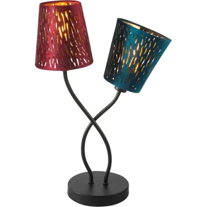 Diese Tischleuchte aus der Serie Ticon ist ein ganz besonderes Wohnaccessoire. Sie eignet sich wunderbar als Nachtischleuchte im Schlafzimmer. Insgesamt spenden zwei Leuchtenschirme Licht. Ein Leuchtenschirm ist rot und der andere ist marineblau, beide Leuchtenschirme sind mit einem Samtstoff überzogen und verfügen über Dekorstanzungen. Durch die Dekorstanzungen wird das Licht eindrucksvoll reflektiert. Die dynamische Ausrichtung der schwarzen Leuchtarme macht den Reiz dieser besonderen Tischleuchte aus. Außerdem verfügt die Leuchte über einen Schalter, der das Ein- und Ausschalten vereinfacht. Die Tischleuchte besitzt zwei E14-Fassungen, dadurch können Sie die Leuchtmittel bis max. 25 Watt frei auswählen. Diese wundervolle Tischleuchte wird garantiert auch in Ihren vier Wänden ein echter Hingucker.