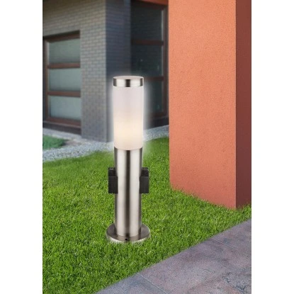 Die moderne, zylinderförmige Wegeleuchte ist aus Edelstahl und opalfarbenem Kunststoff gefertigt und eignet sich ideal für die Festinstallation im Außenbereich. Mit ihrer schlichten Form ist sie ein Blickfang sowohl im Eingangsbereich als auch im Garten oder auf der Terrasse. Sie ist mit zwei spritzwassergeschützten Steckdosen im Sockel (IP44) und einer E27 Fassung für max. 60 W ausgestattet. Das passende Leuchtmittel ist separat erhältlich.
